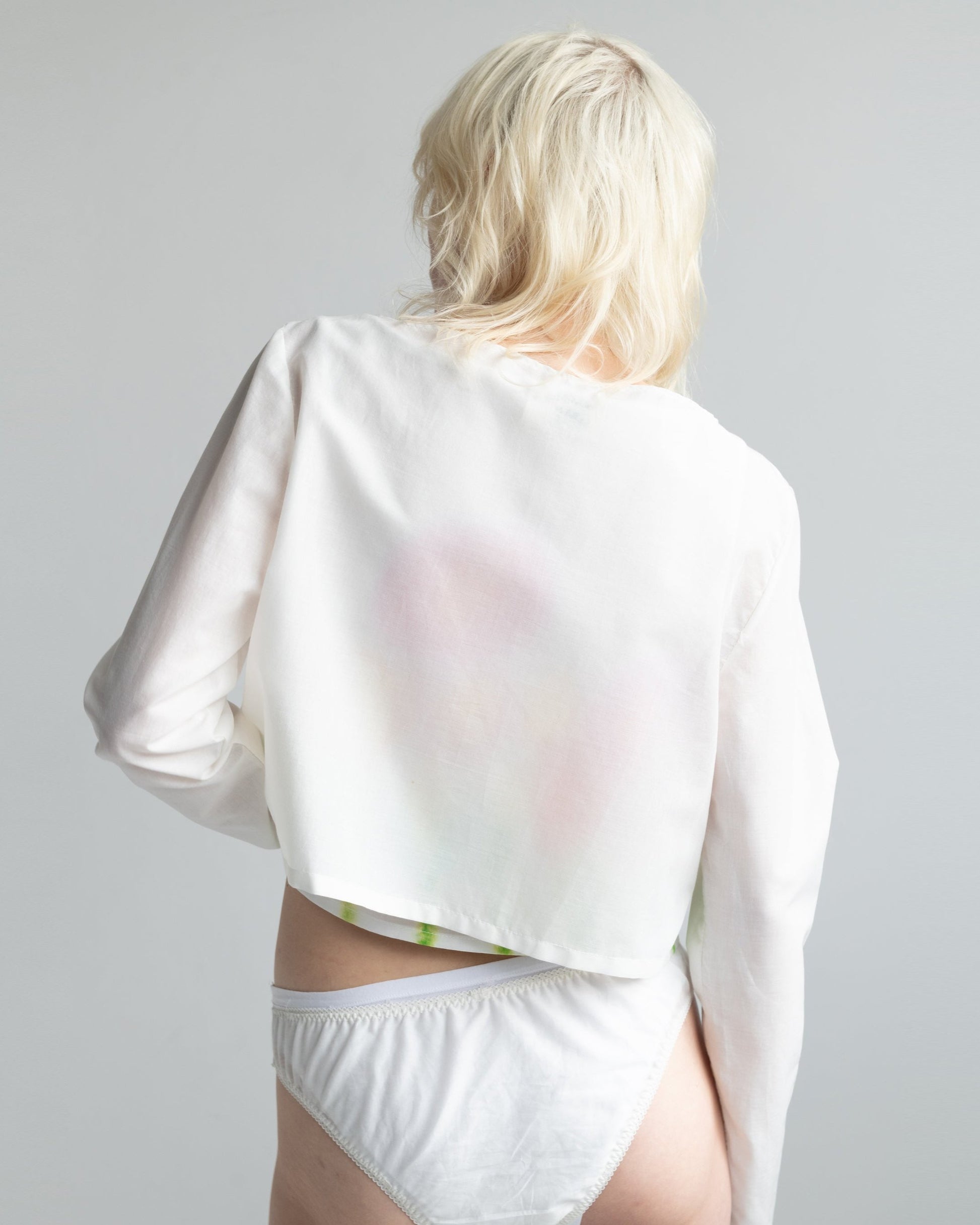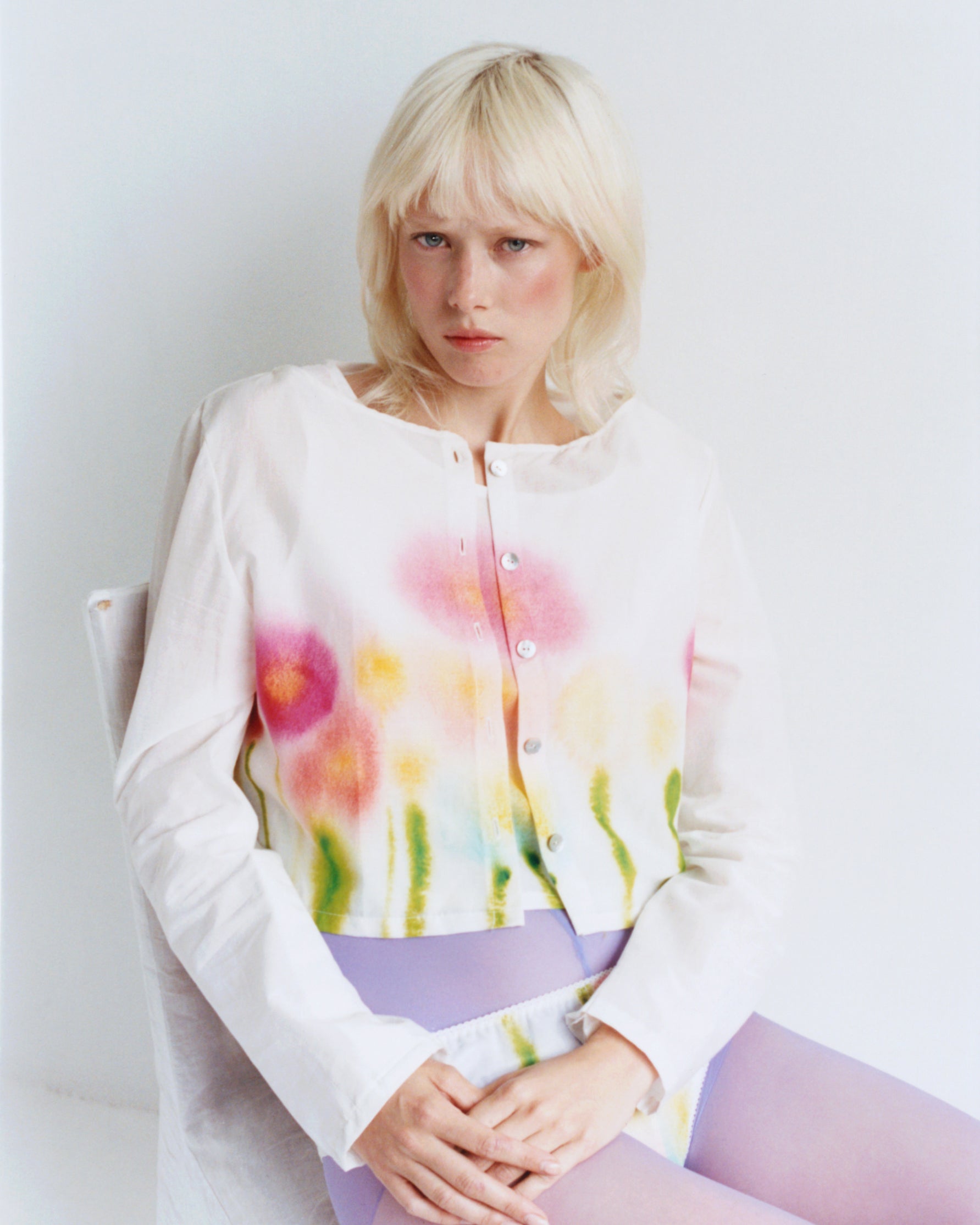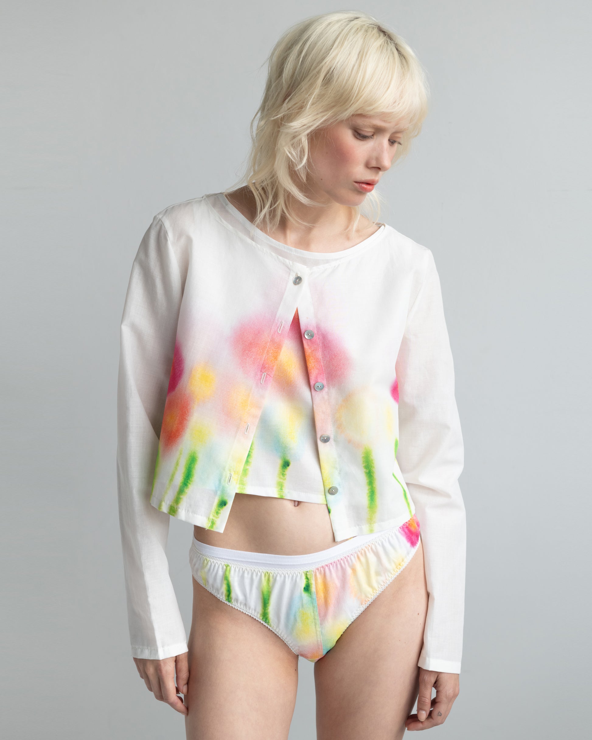 Cardigan en coton imprimé avec un motif floral, basé sur un dessin peint à la main.