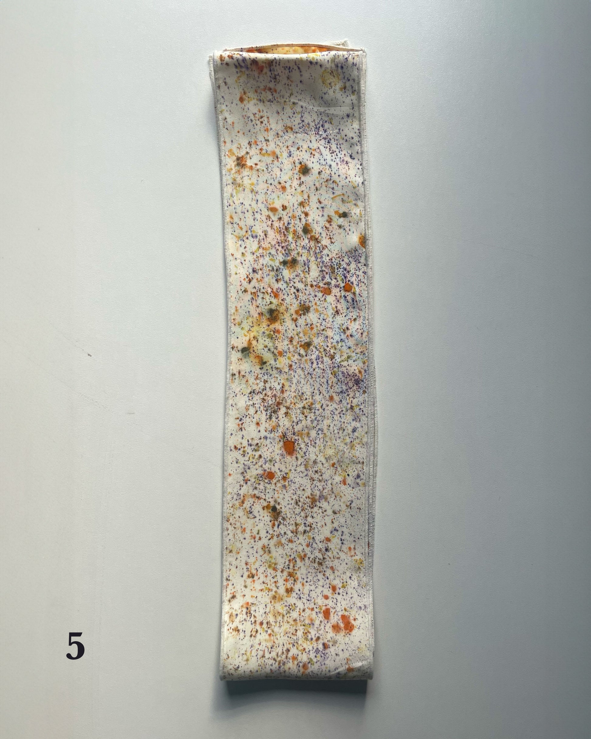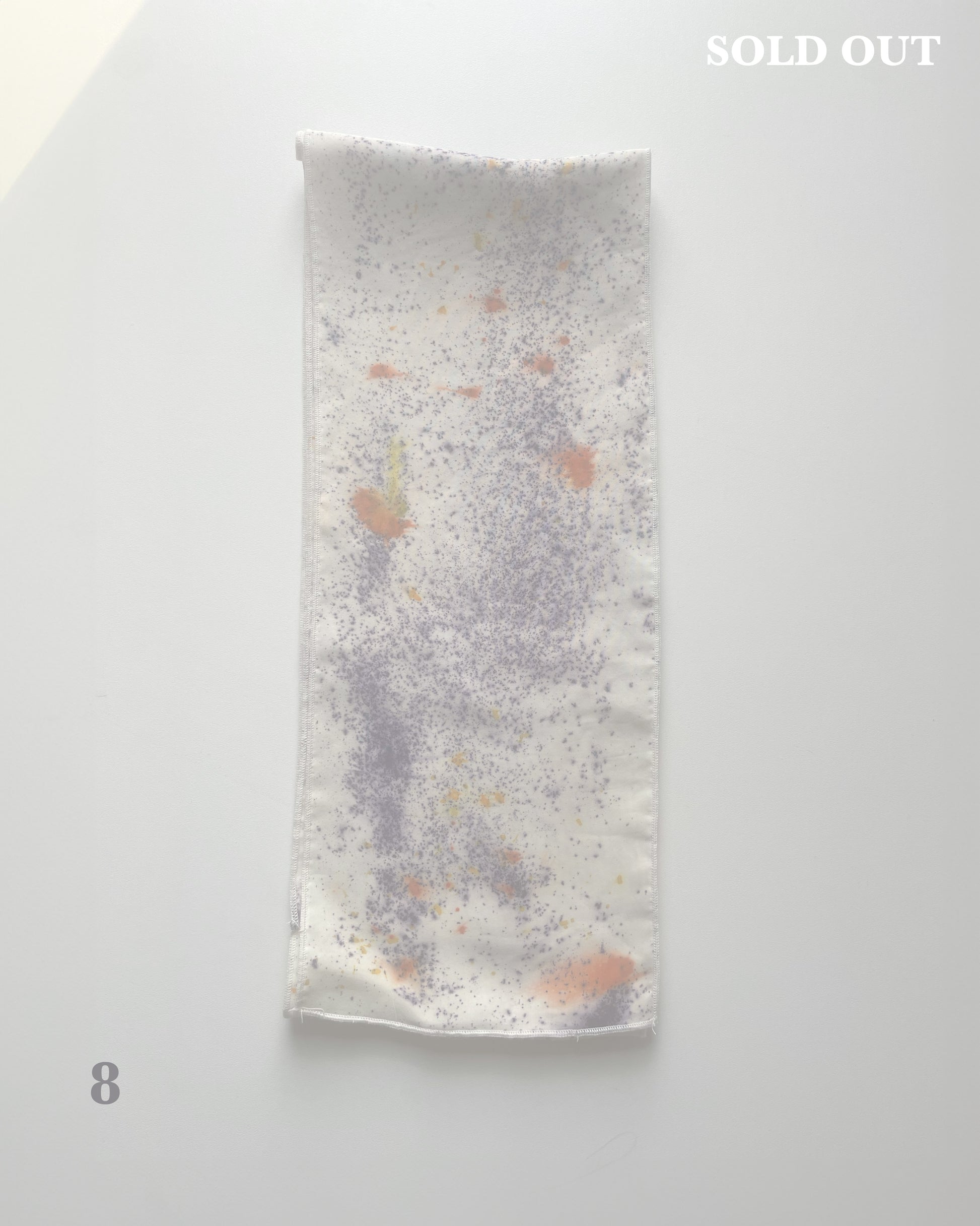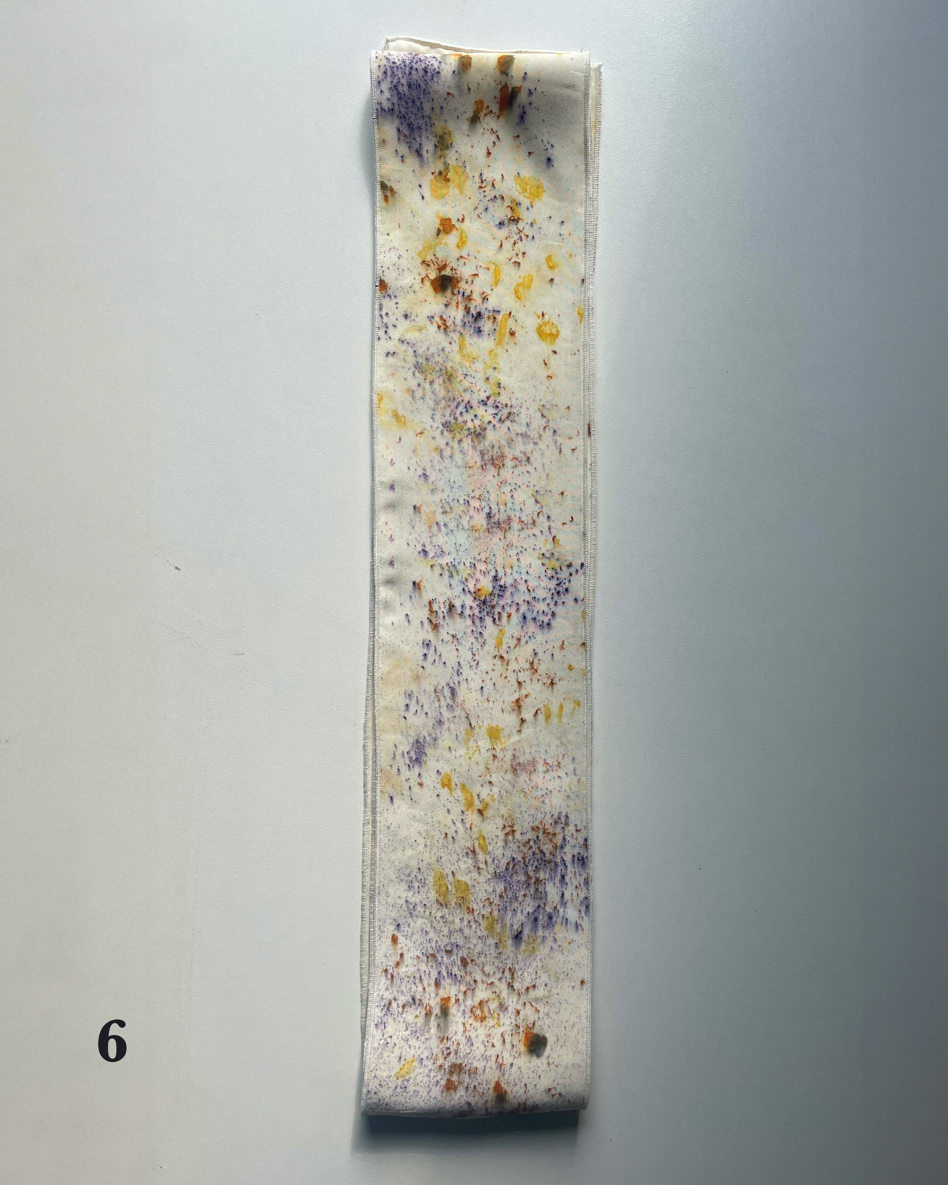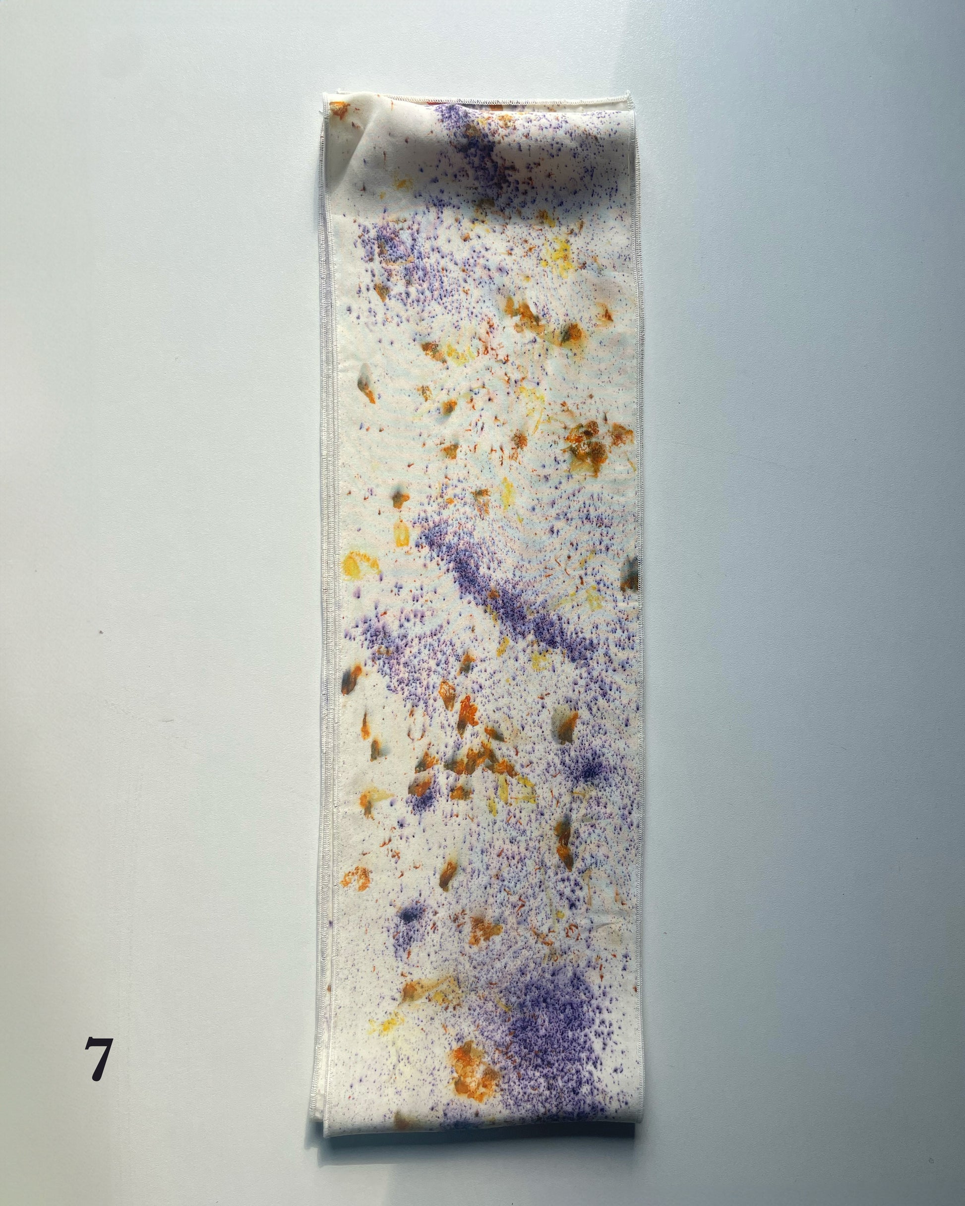 Ce foulard en soie léger est entièrement imprimé à la main à partir de vraies fleurs et plantes. La technique d'éco-impression capture les pigments naturels du bois de campêche , de l'anthémis et du cosmos sulfureux , créant une composition botanique abstraite aux tons chauds d'orange et de violet.