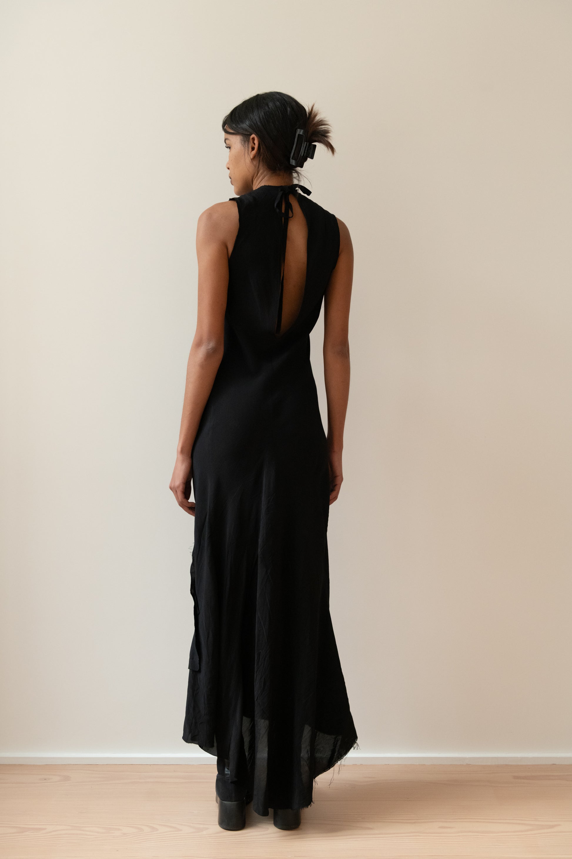 La robe présente un design unique inspiré des fleurs, créé à travers des panneaux et des coutures visibles, ajoutant de la texture et de l'élégance à la silhouette.